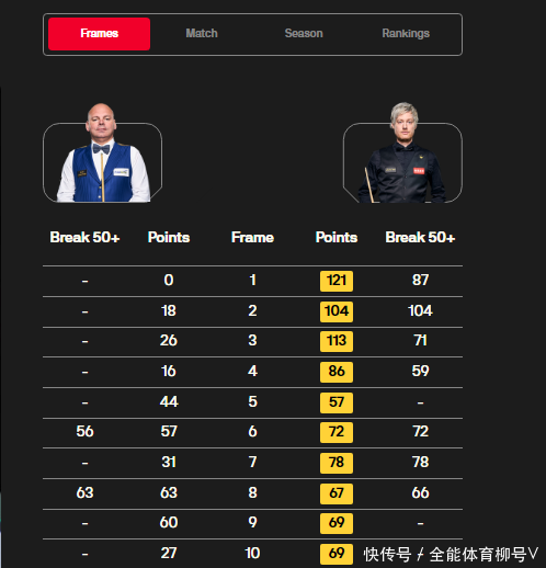 这场比赛,“萝卜”的开局欠安,肖国栋单杆54分获取1-0开门红,第二局又打出单杆99分,100-0零封罗伯逊,2-0扩大跨越上风。第三局,罗伯逊在开场连丢两局之后,单杆92分扳回一局。